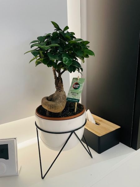 Osłonka Modern to biała,ceramiczna doniczka umiejscowiona na stojaku w kolorze czarnym.
