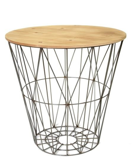 Nowoczesny stolik kawowy, wykonany z drucianego kosza i blatu w kolorze naturalnego dębu.