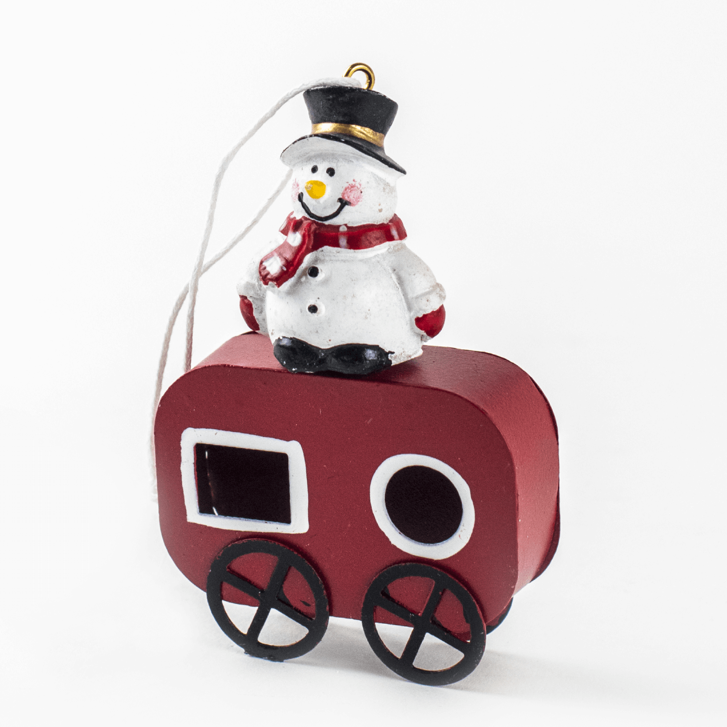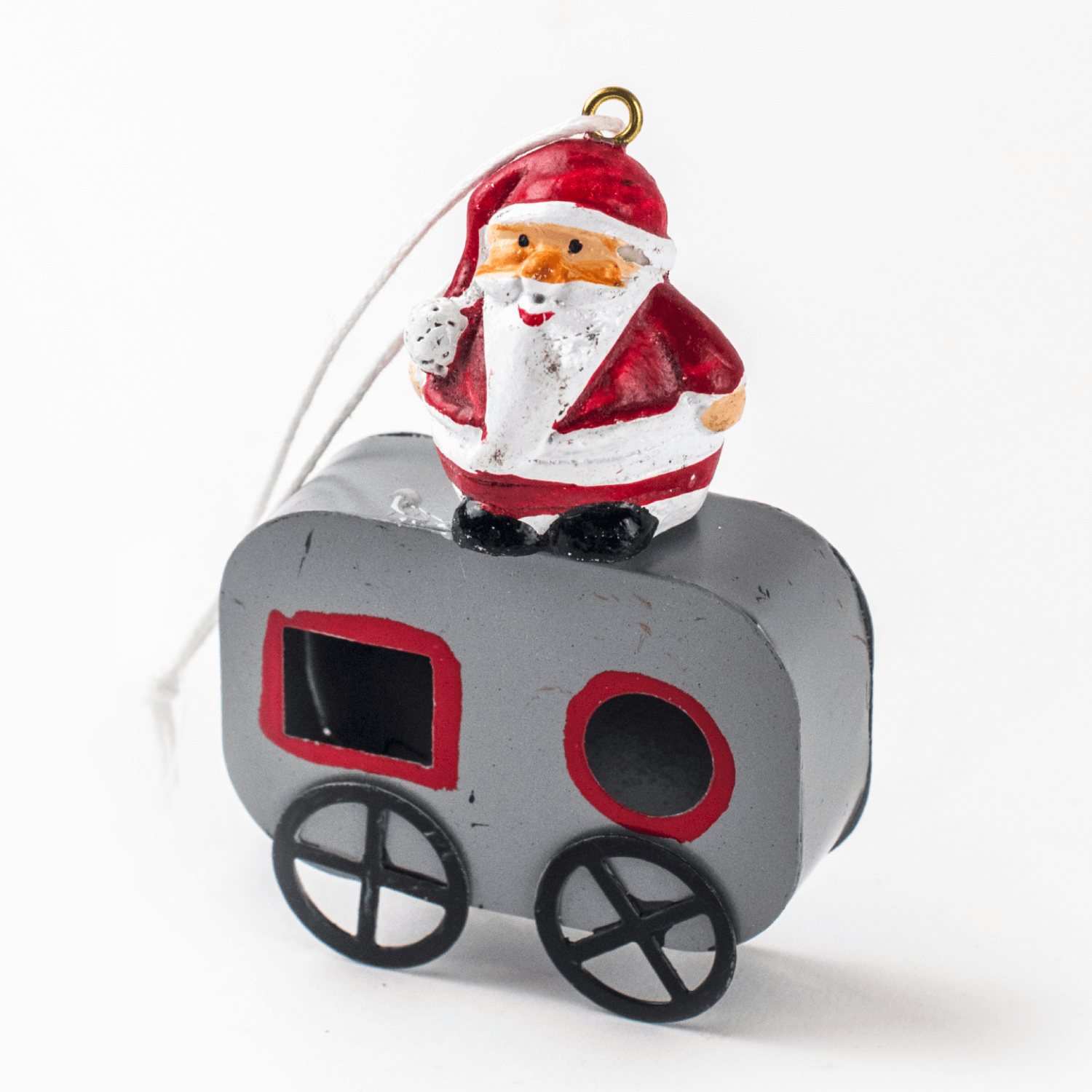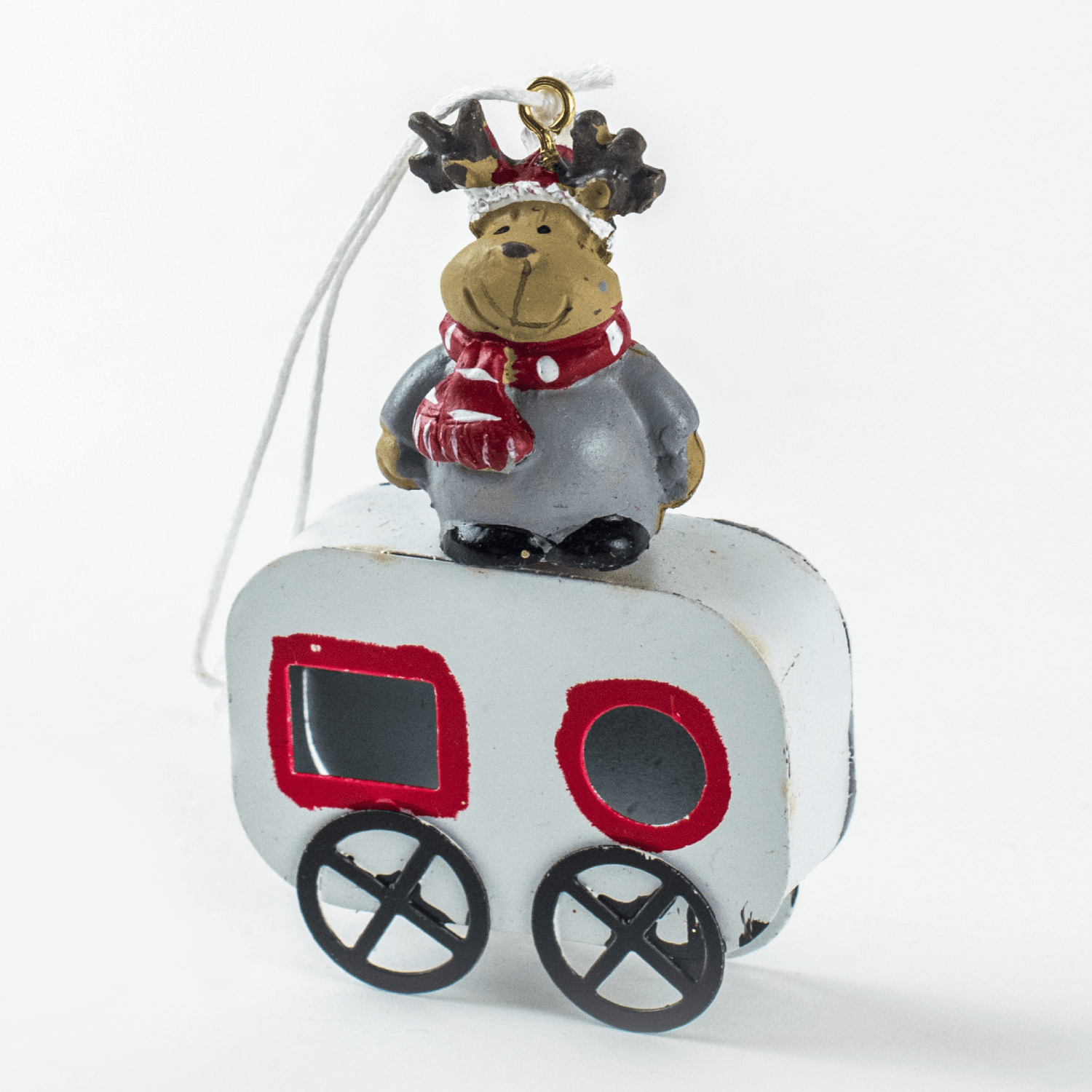 Metalowa zawieszka na choinkę w kształcie przyczepy z figurką. Do figurki zamocowany jest sznurek do zawieszenia ozdoby na choincę.
