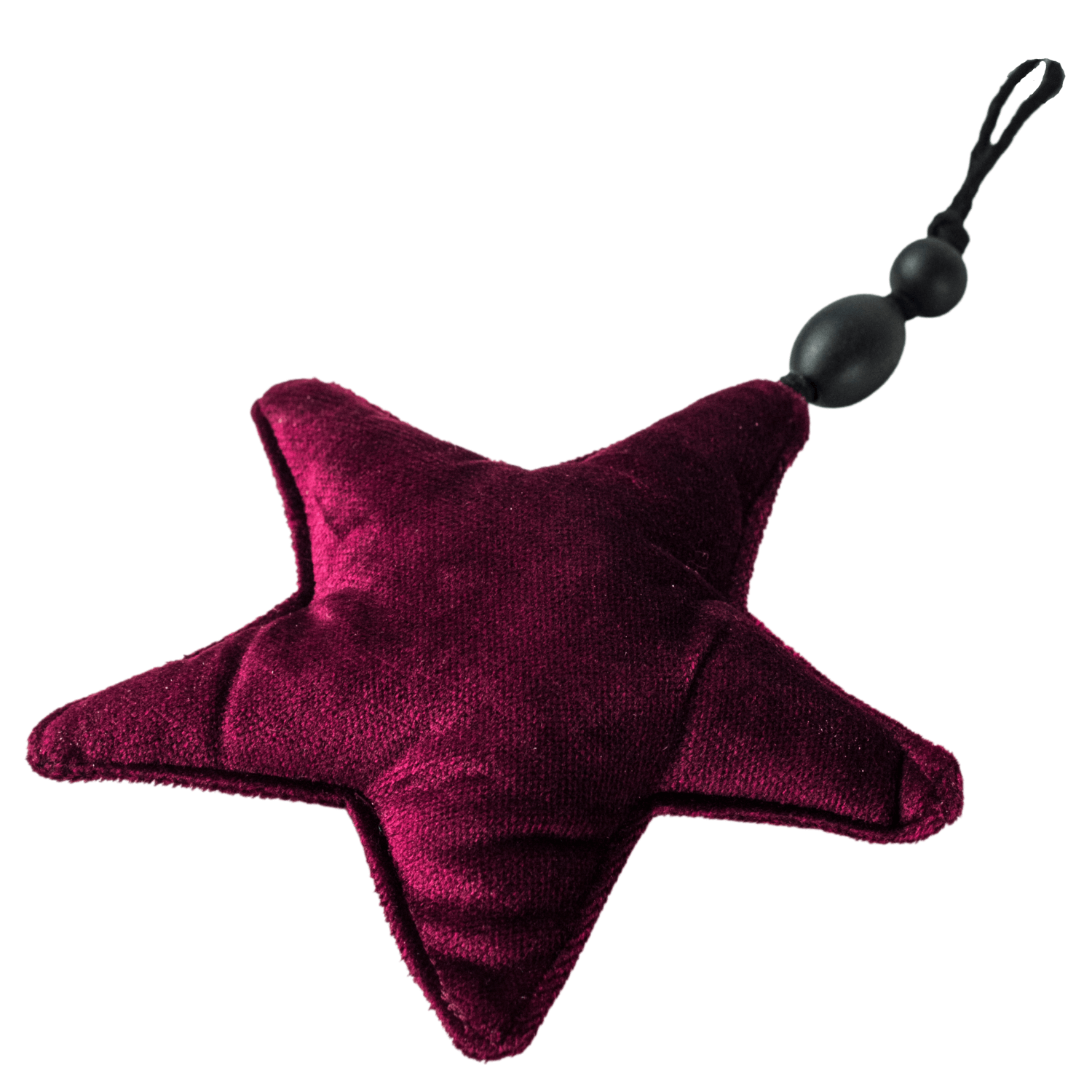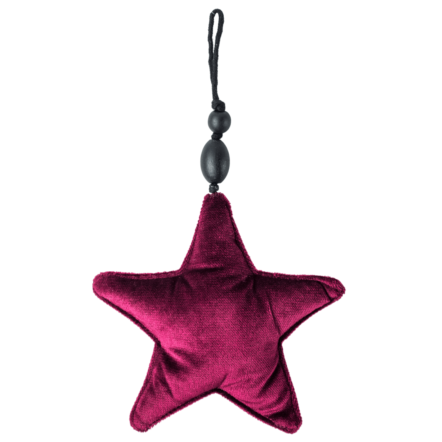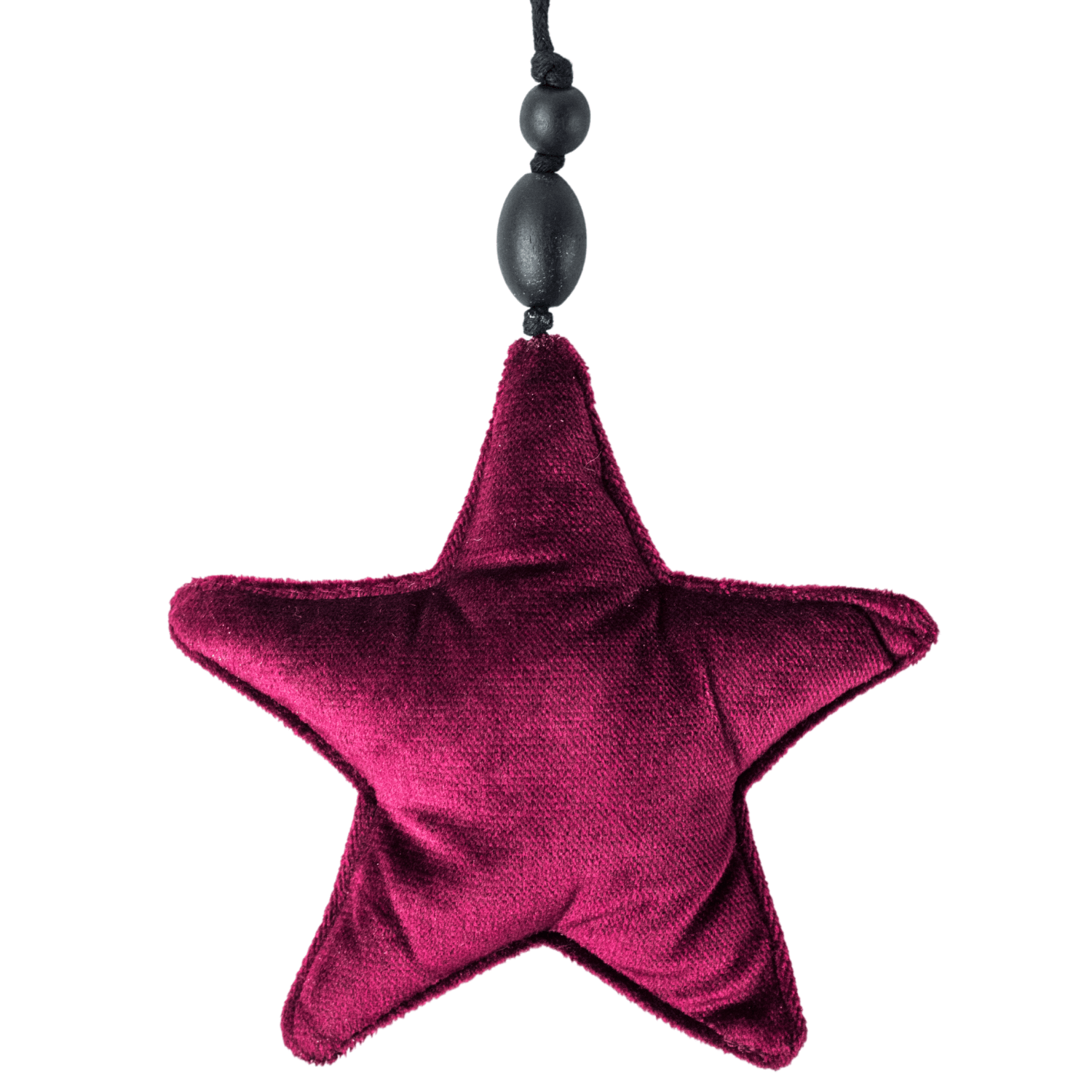 Bawełniana zawieszka na choinkę w kształcie gwiazdy w kolorze bordowym. Do gwiazdki zamocowany jest jutowy sznurek z drewnianymi koralikami.