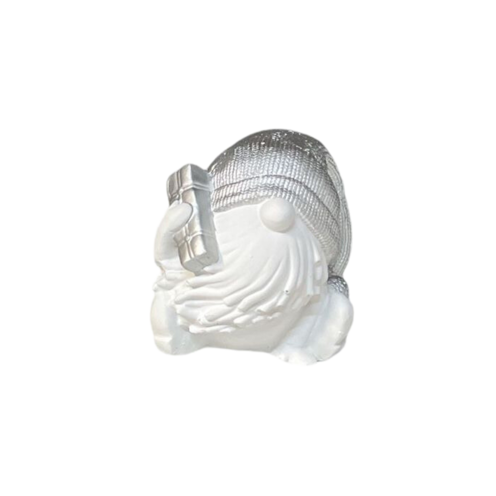 Figurka gipsowa gnom siedzący biało-srebrna 10 cm – urocza ozdoba świąteczna
