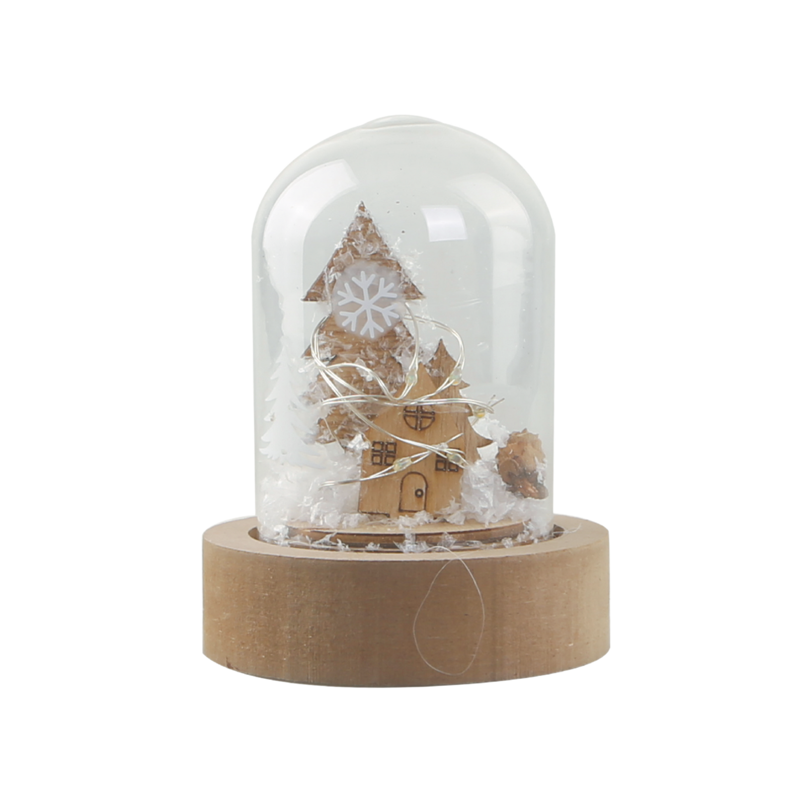 • Nowoczesny i klasyczny design: Przezroczysta kopuła w połączeniu z drewnianą podstawą to stylowy element, który świetnie wpasuje się zarówno w tradycyjnie urządzone wnętrza, jak i w nowoczesne aranżacje.