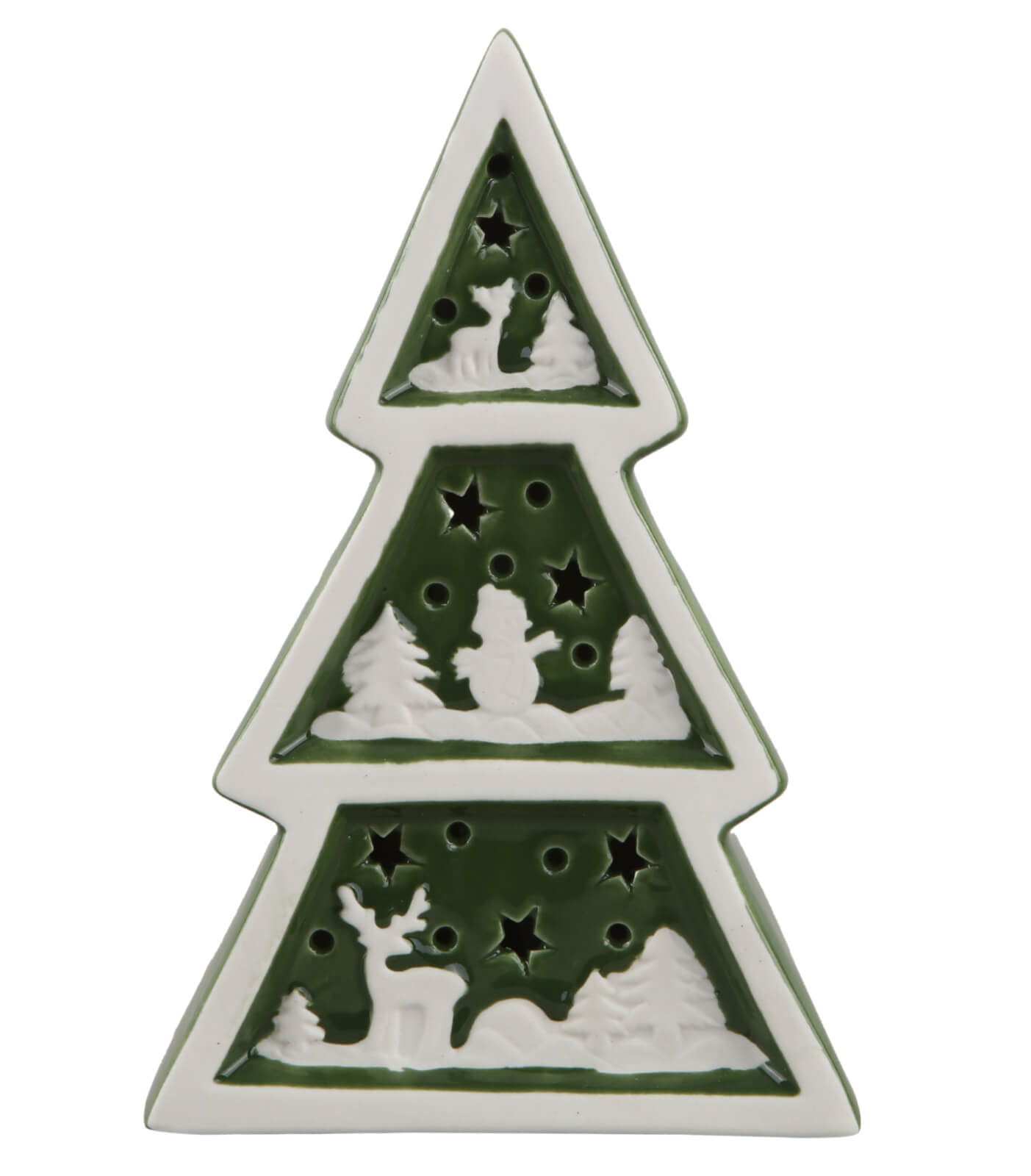 Stwórz wyjątkową atmosferę świąt w swoim domu dzięki tej oryginalnej figurce LED w kształcie choinki! Ozdobiona białymi i zielonymi akcentami, z pięknymi, wyciętymi detalami przedstawiającymi renifery, śnieżne choinki i gwiazdki. Wewnątrz choinki znajdują się diody LED, które delikatnie rozświetlają pomieszczenie, dodając mu przytulności i świątecznego blasku.