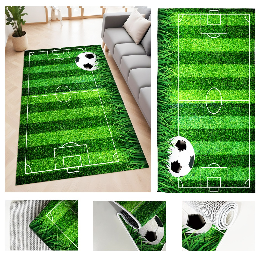 - Dywan charakteryzuje się wzorem boiska do piłki nożnej, który zawiera realistyczne elementy takie jak linie boiskowe i piłka. Wzór jest utrzymany w odcieniach zieleni, co przypomina prawdziwą murawę piłkarską, co czyni go idealnym wyborem dla młodych fanów piłki nożnej.