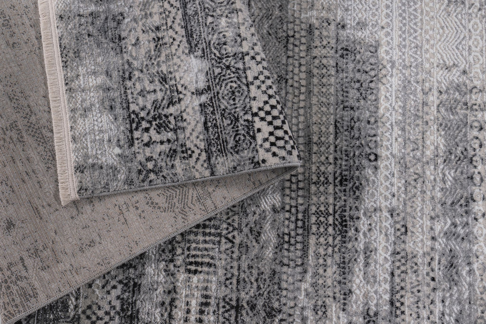 - Dywan charakteryzuje się subtelnym wzorem w różnych odcieniach szarości z dodatkiem bieli, co nadaje mu elegancki i nowoczesny wygląd. Taka kolorystyka sprawia, że dywan doskonale komponuje się z różnymi stylami wnętrz, od klasycznych po nowoczesne.