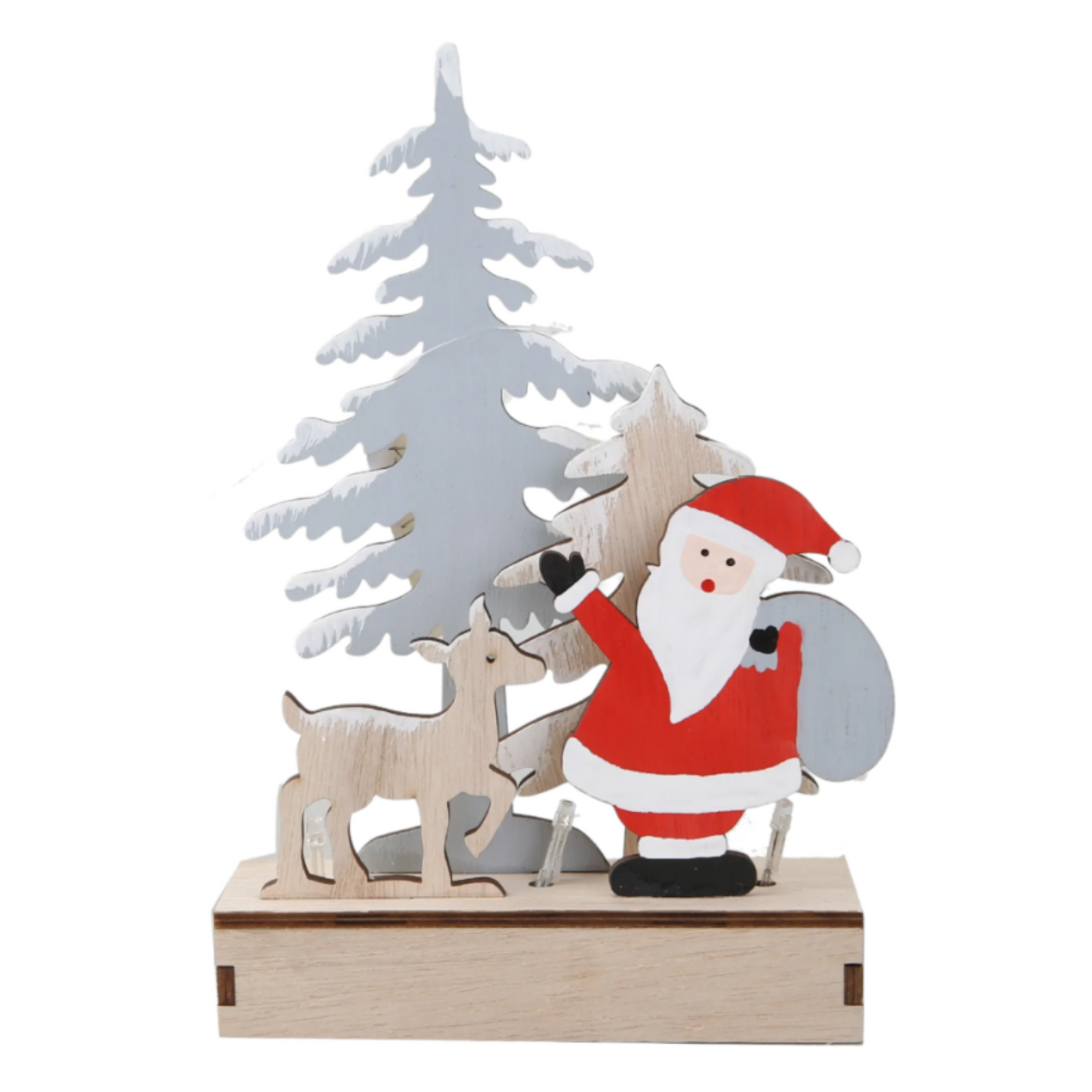 Wprowadź do swojego domu ciepłą, świąteczną atmosferę dzięki tej uroczej, drewnianej dekoracji bożonarodzeniowej! Przedstawiająca wesołego Mikołaja, stojącego obok choinki i sympatycznego renifera, ta ozdoba z pewnością przyciągnie wzrok i doda wnętrzu magicznego, świątecznego klimatu.