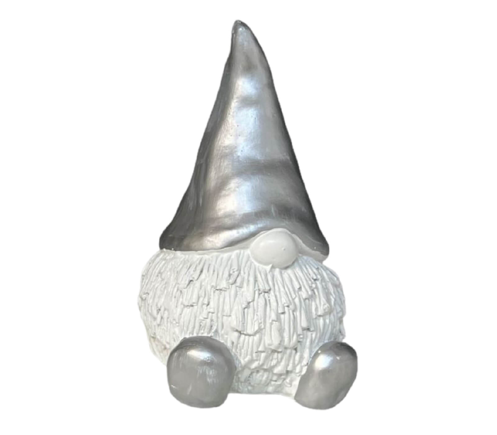 Wyjątkowy design: Figurka przedstawia uroczego gnoma siedzącego, z długą, białą brodą i charakterystycznym spiczastym kapeluszem. Srebrne elementy takie jak kapeluszu i buty nadają figurce elegancji i sprawiają, że doskonale komponuje się zarówno w nowoczesnych, jak i tradycyjnych wnętrzach.