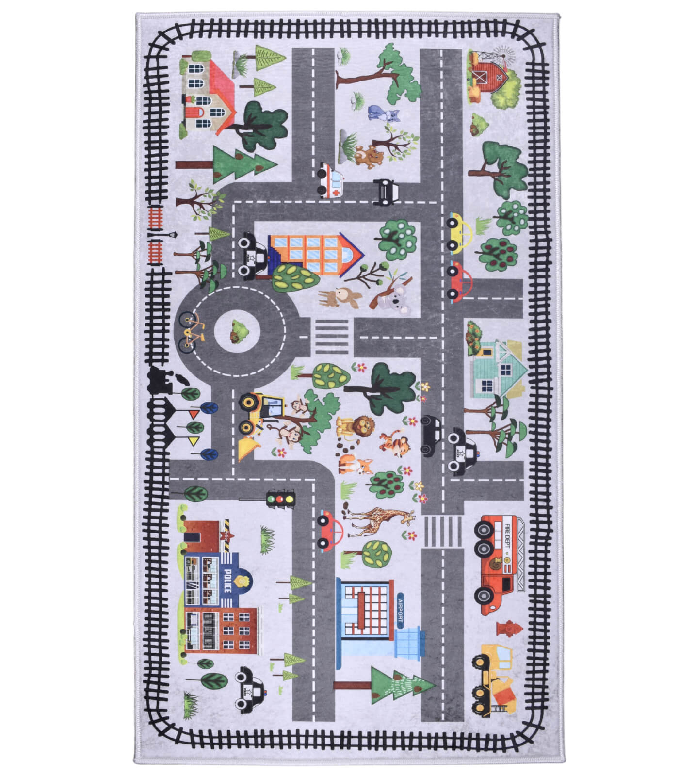 • Elementy infrastruktury miejskiej: Na dywanie znajduje się wiele szczegółów, takich jak budynki (policja, szpital), sygnalizacja świetlna, droga, tory kolejowe oraz przystanek autobusowy, które pomagają dzieciom zrozumieć podstawowe zasady ruchu drogowego oraz codzienne życie w mieście.