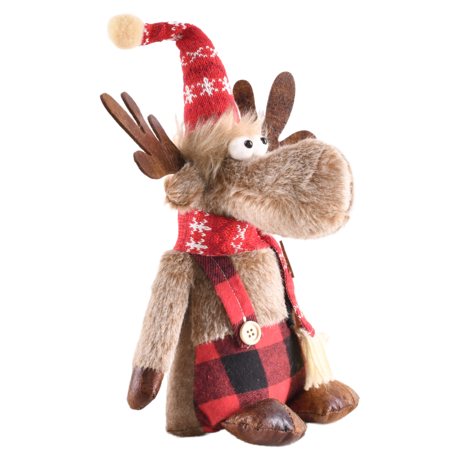 Renifer ubrany jest w uroczy, czerwony szalik ozdobiony zimowymi motywami oraz kapelusz w stylu bożonarodzeniowym, który dodaje mu wyjątkowego uroku. Jego rogi wykonane zostały z przyjemnego w dotyku materiału, który imituje naturalną fakturę. Dzięki ciepłej kolorystyce dekoracja ta świetnie wkomponuje się zarówno w klasyczne, jak i nowoczesne wnętrza.