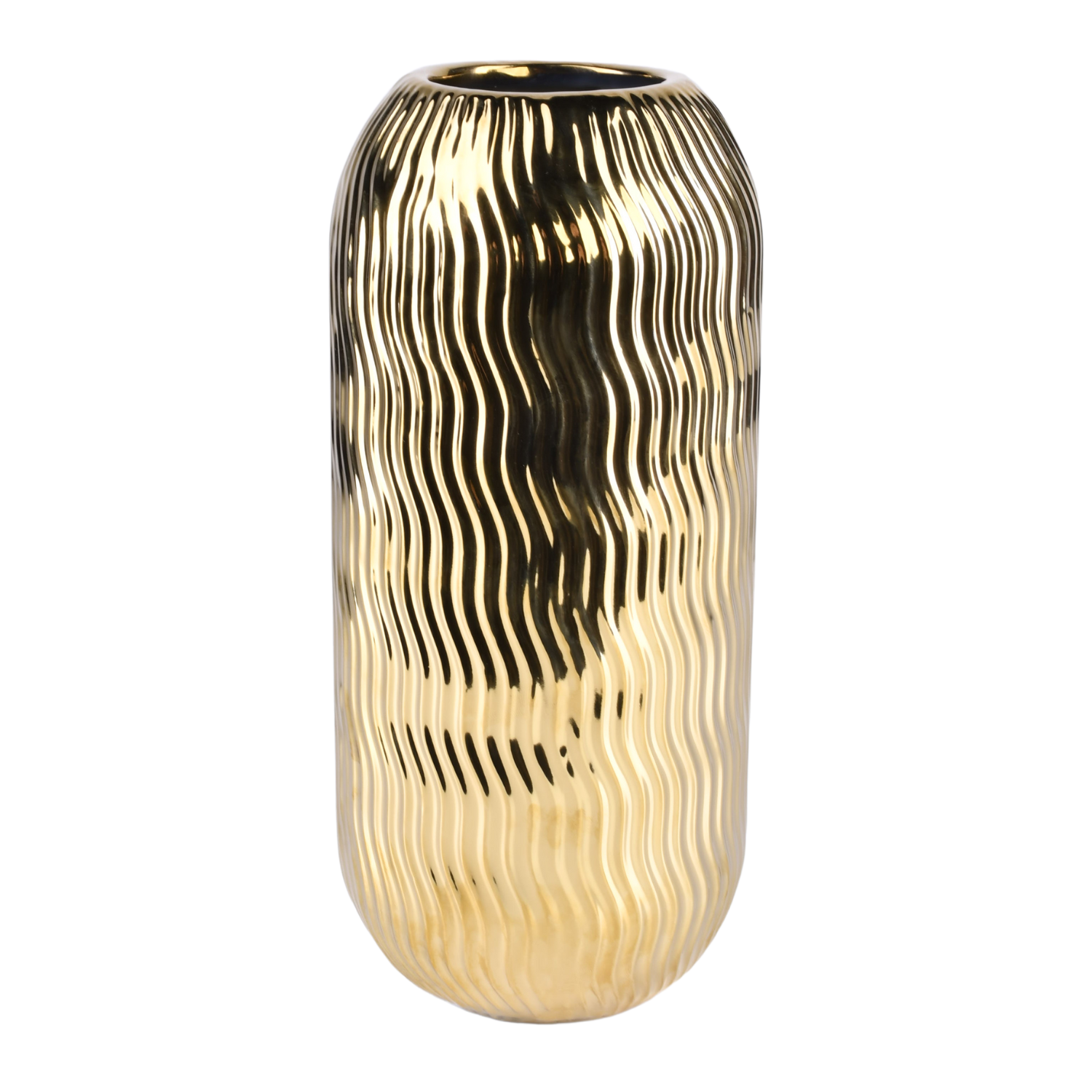 Wazon LOBO wyróżnia się niepowtarzalną, falistą fakturą, która pięknie odbija światło i tworzy efekt trójwymiarowej głębi. Lśniące złote wykończenie dodaje mu elegancji i czyni z niego wyrazisty element dekoracyjny, doskonale prezentujący się zarówno w świetle dziennym, jak i przy sztucznym oświetleniu.