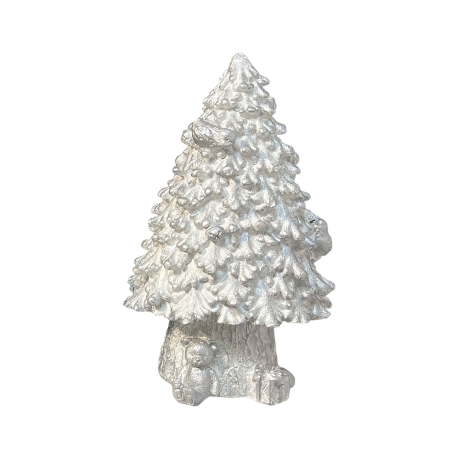 Figurka betonowa miś pod choinką biało-srebrna – urocza ozdoba świąteczna